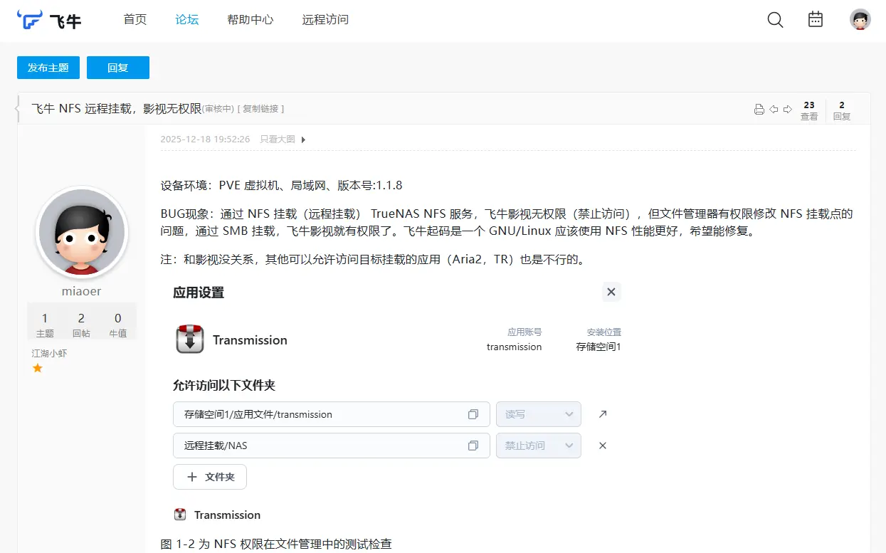 有问题,使用 NFS 协议挂载其他 NAS,无法在 “应用” 中正确使用权限,但在文件管理里面可以正常使用任意权限,而不是“禁止读写”