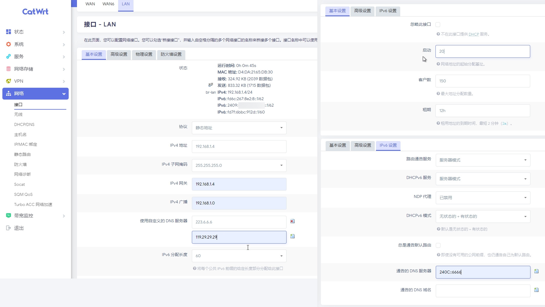 IPv6 是默认打开,DHCP 这里默认 50 起也不是不行我这里我喜欢改到 20,因人而异吧