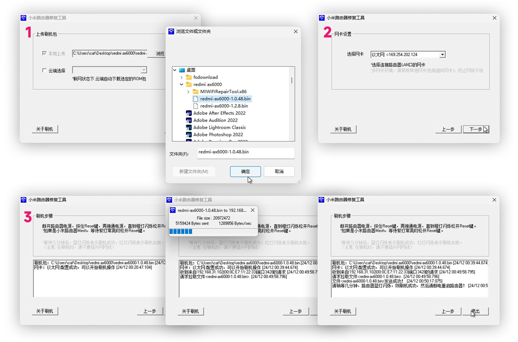 在小米官方修复工具中把我们预先下好的官方固件选上,下一步网卡这里我这里只有一个继续,