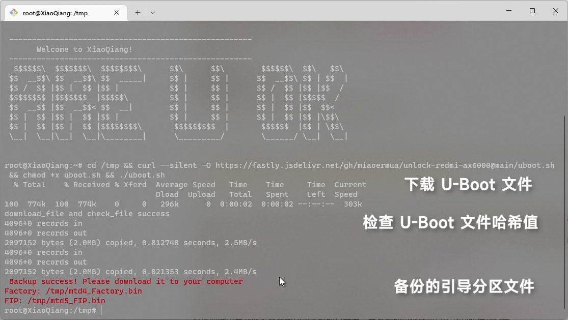 cd /tmp && curl --silent -O https://raw.miaoer.net/unlock-redmi-ax6000/cn/server/uboot.sh && chmod +x uboot.sh && ./uboot.sh完成后会有一段代码飘过其中前面的是下载并且校验 U-boot 文件的哈希值,备份引导分区和提示部分