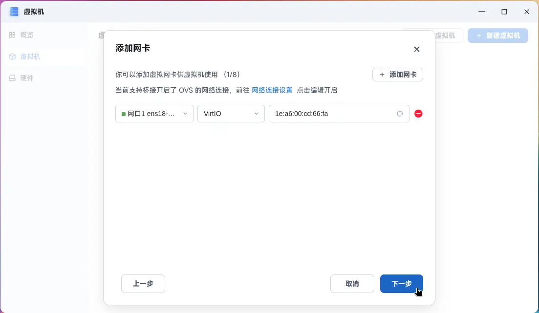 这里我们完成了前置步骤开启了网卡 OVS,所以这里网口选择一下,类型 VIrtlIO 可以保持默认,MAC 地址默认,虚拟机配置完成。